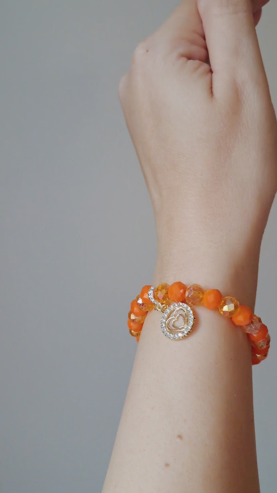 Ignite your style with faceted orange and golden crystal beads, it shimmers with fiery elegance. The sparkling gold heart charm adds a touch of romance, making this bracelet the perfect piece to brighten both casual and dressy looks.